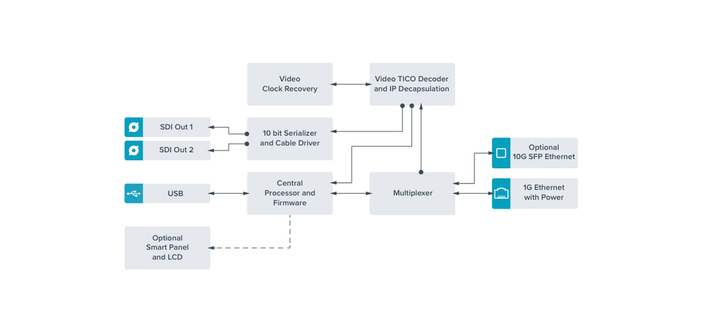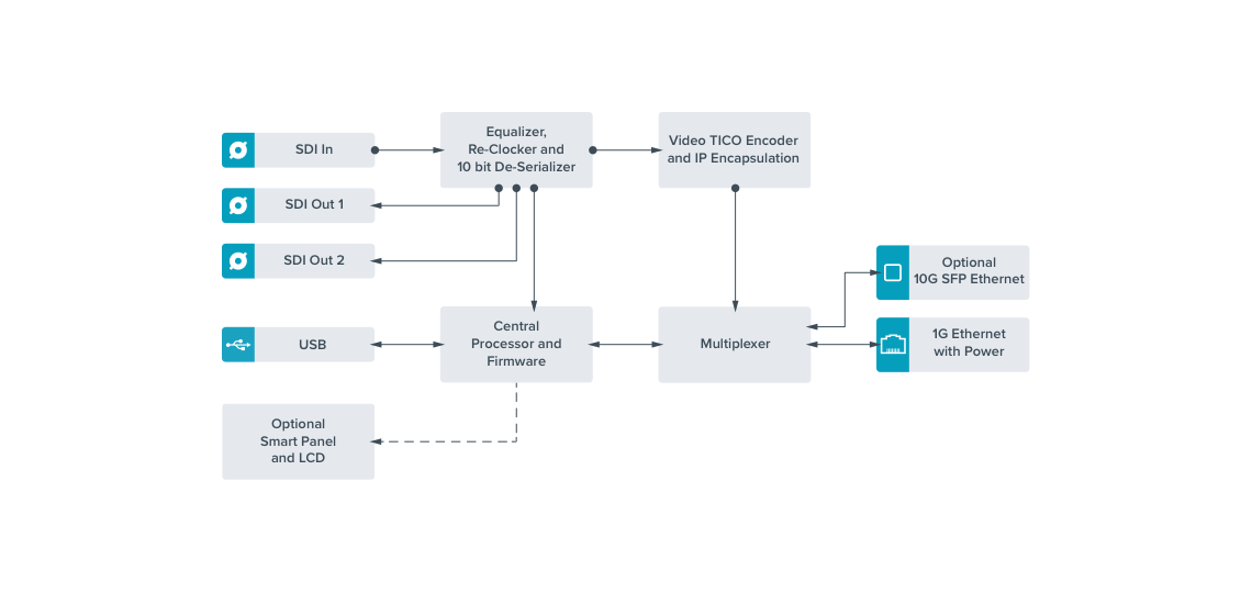 Gigabit ethernet supports 3G-SDI up to 1080p60 using TICO encoding/decoding. Optional 10G optical data ethernet supporting Ultra HD up to 2160p60 using TICO encoding/decoding.