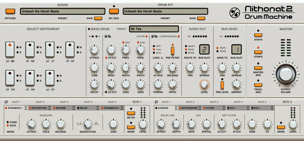 Nithonat 2 is a TR-606 emulation, offering punchy, analog drum sounds with real-time modulation.