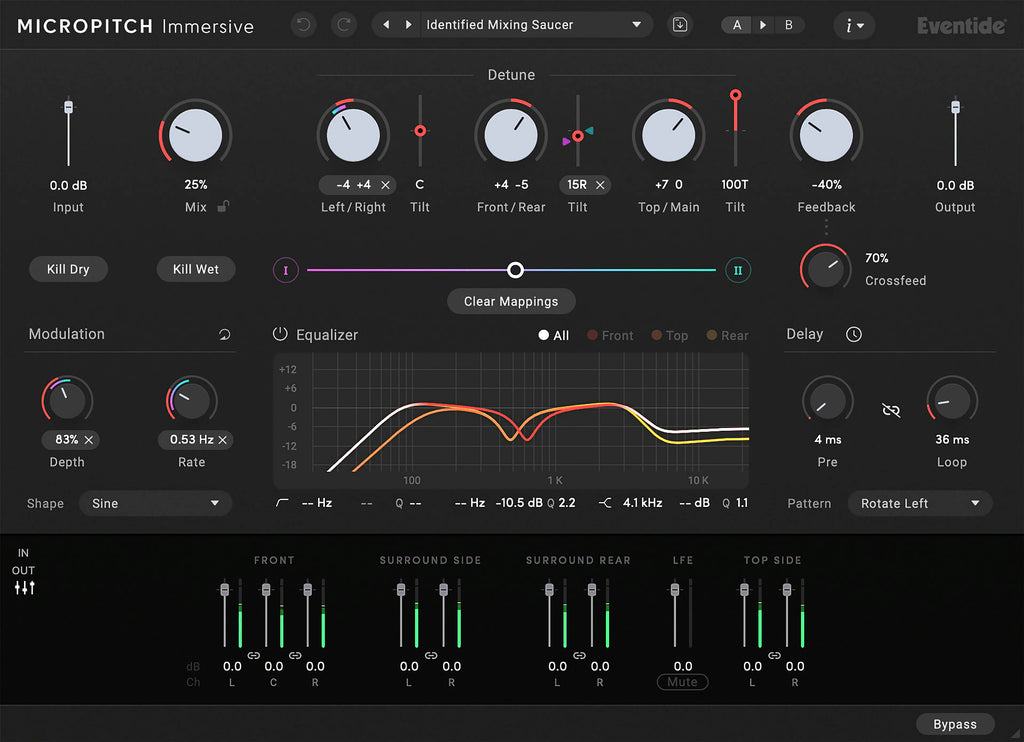 - Tilt the Left/Right, Front/Back, and Top/Main Detune parameters for quick and easy asymmetrical detuning and space fine tuning