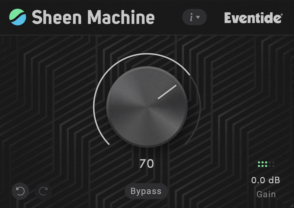 A straightforward user interface focused specifically on what matters: Adding tonal sheen to incoming audio. Turn the dial, hear the added sheen. The Sheen Machine user interface also includes undo/redo, input gain and built-in bypass.