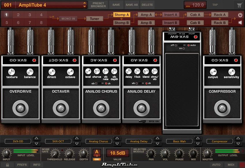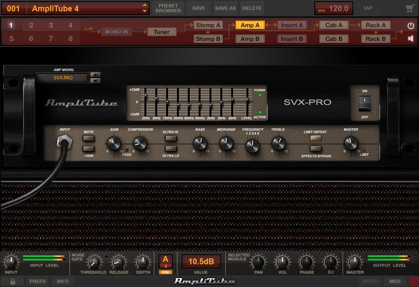 AmpliTube SVX features 18 models including 4 amps, 6 cabinets and 8 stomps, giving you the "Greatest Hits" amps, from the earth-shattering sound of Rock & Roll bass from the SVT – the Grandaddy of them all, to the smooth groove-making rolls of the B-15. The scooped edginess of the 4Pro. Plus a complete set of bass-specific pedals to give you unprecedented tone shaping options.