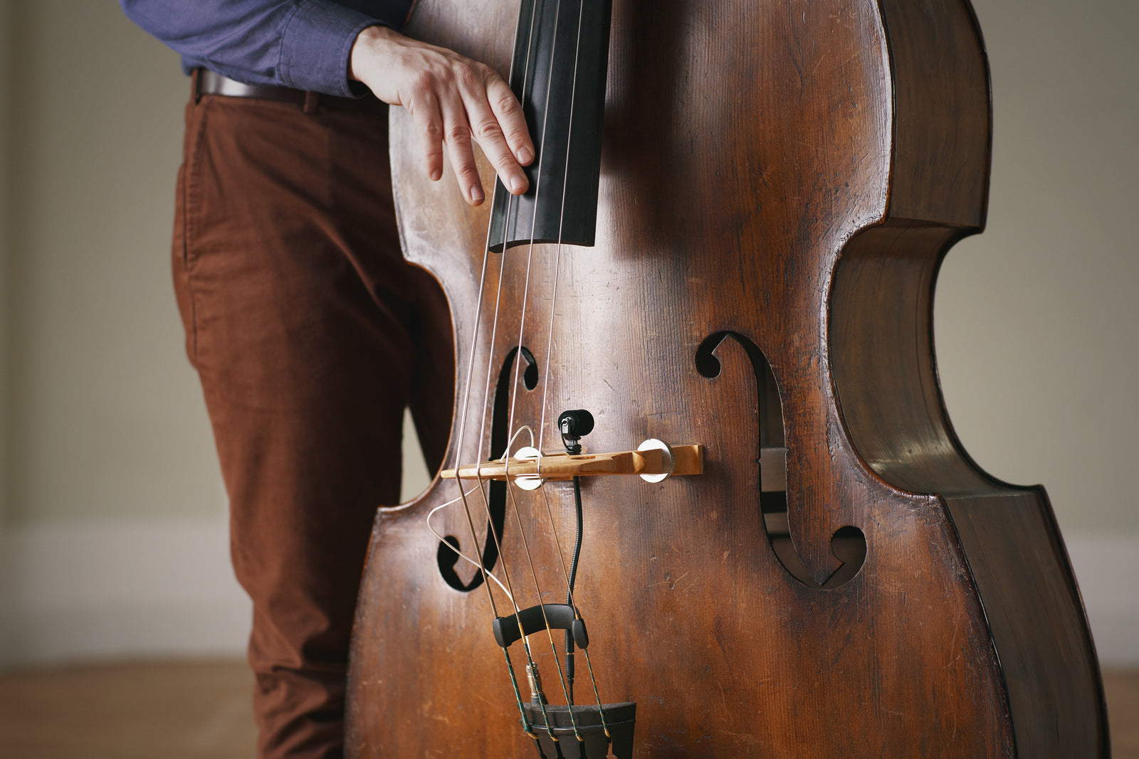 Clip for attaching the capsule and gooseneck of the Miniature Clip Mic system to the strings of a double bass below the bridge. The gooseneck holder rotates and locks in 45° increments to allow you to adjust the orientation.