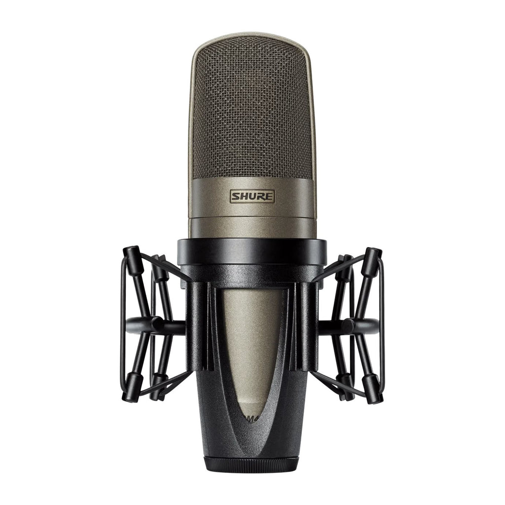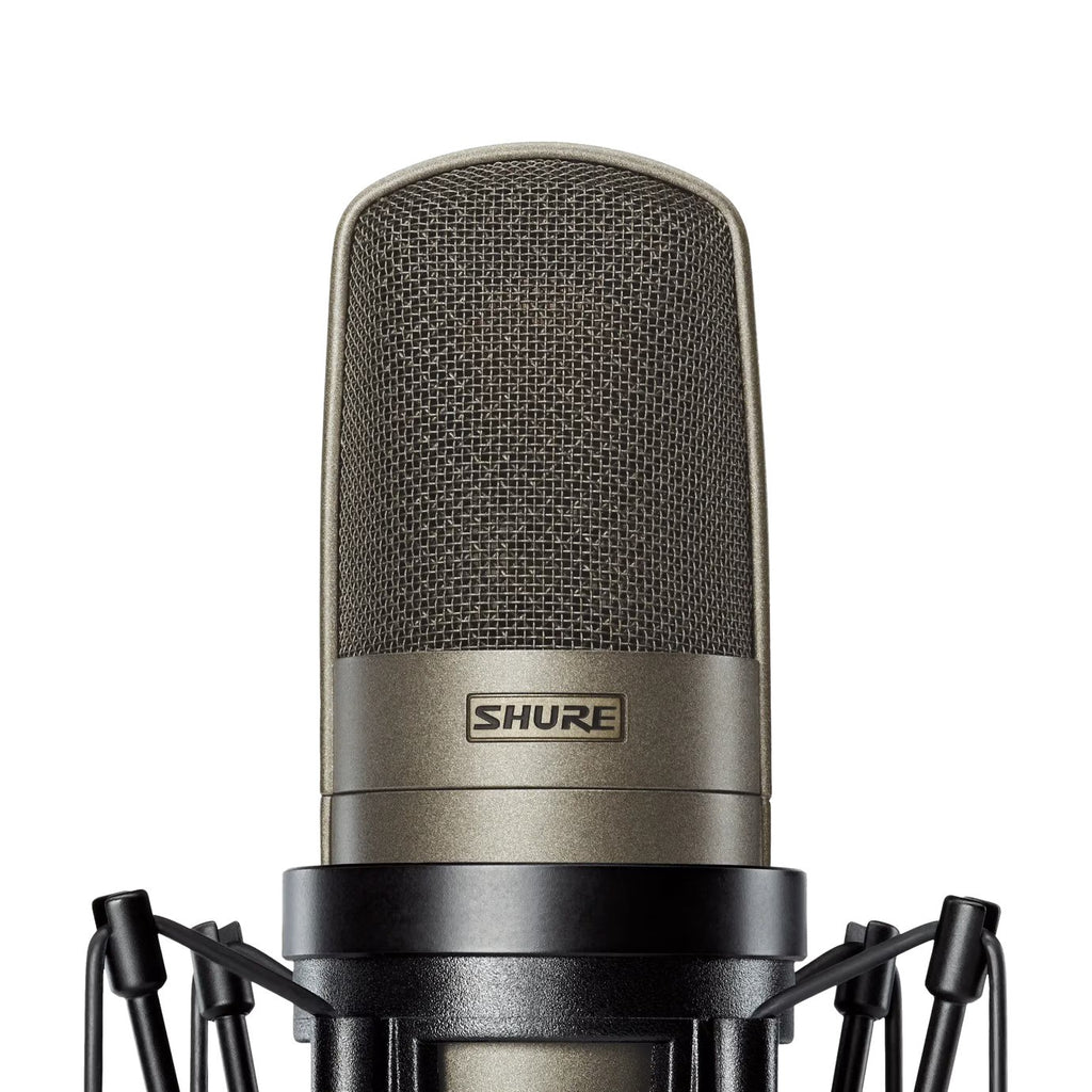 - Open cage ShureLock® rubber suspension shock mount with low-profile Popper Stopper™ magnetic pop filter produces a natural space between performer and microphone