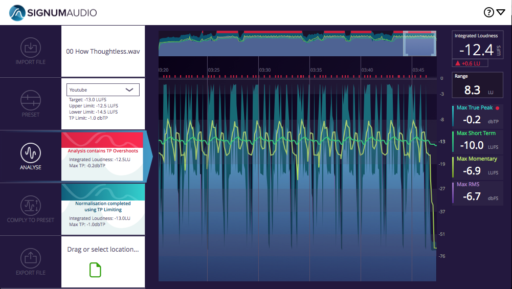 4) Click "Comply" to normalise your audio - the metering graph clearly shows the extent of true peak limiting.