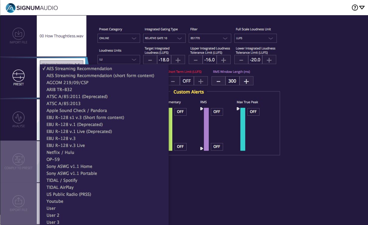 Bute is fully compliant with all revisions of ITU-R BS. 1770, EBU R128, ATSC A/85, OP-59, ARIB TR-B32, Spotify, YouTube, Apple Check, Hulu, Netflix (including the latest revision), TIDAL, Sony Gaming (ASWG), AES Streaming Recommendation, US Public Radio (PRSS), TIDAL and Pandora.