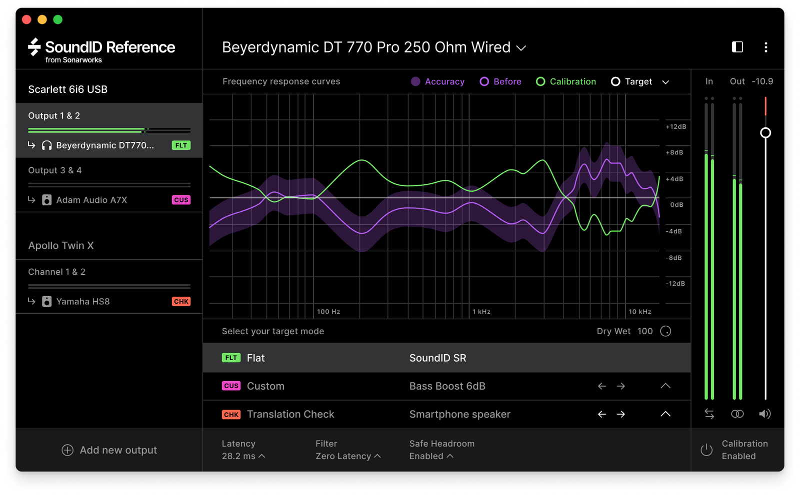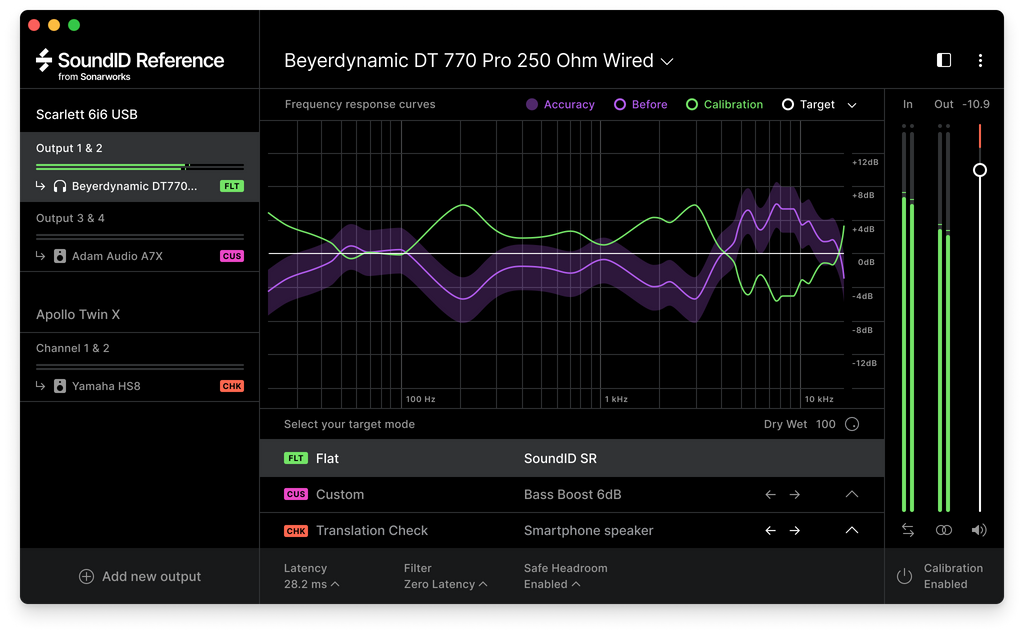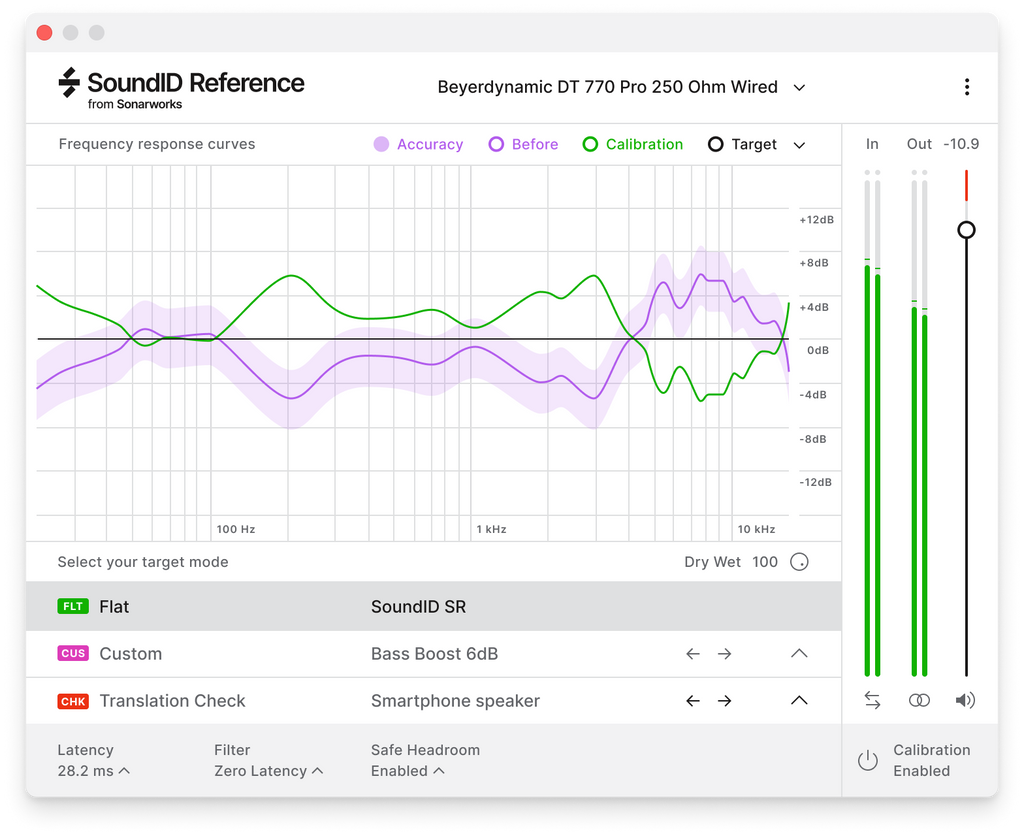 A headphone calibration software delivering consistently accurate studio reference sound on your existing headphones. Software includes presets of more than 280 headphone calibration profiles. With an applied headphone calibration profile the software sets the frequency response target to be completely flat across all audible frequencies. The headphone frequency response target is designed to emulate neutral-sounding speakers. With calibrated headphones you’ll hear a flat, consistent sound wherever you go.