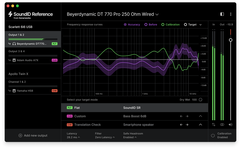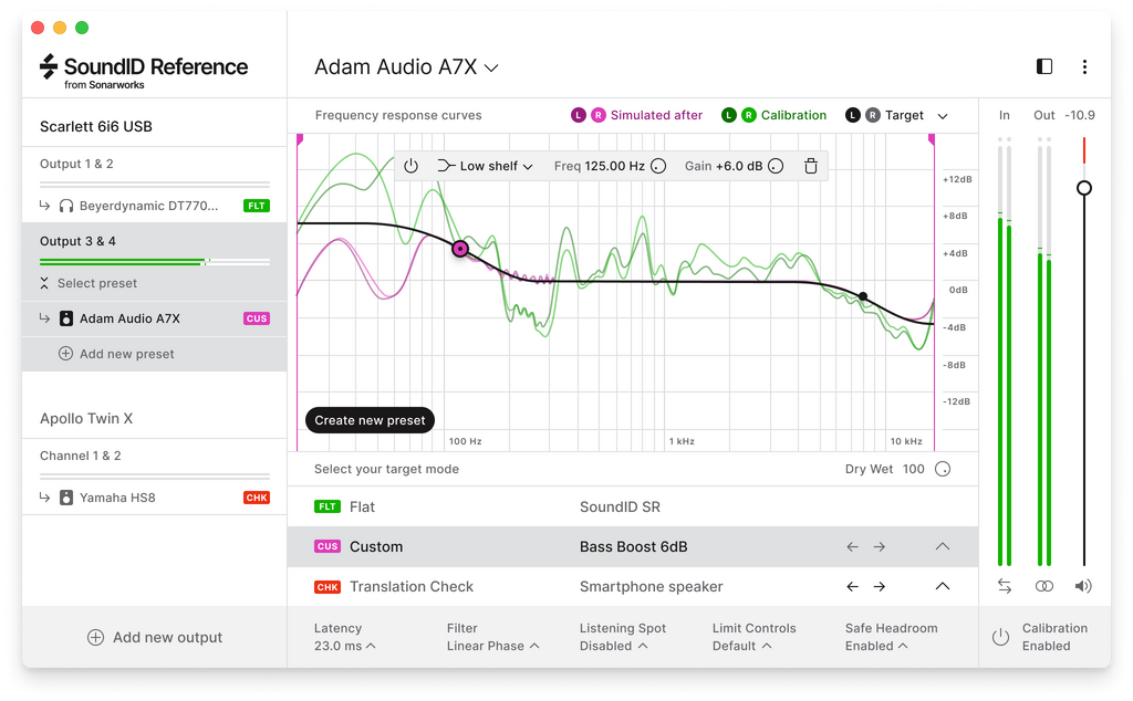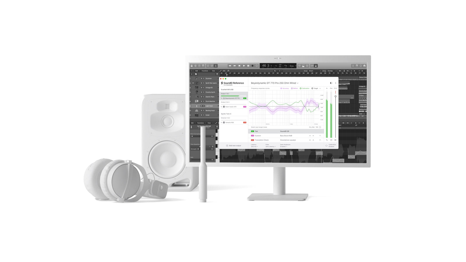 In less than 20 minutes you can calibrate your existing studio speakers with a SoundID Reference measurement microphone and calibrate your existing headphones with more than 280 headphone calibration profiles already included in the software as ready-to-use presets. With an applied calibration profile the software sets the frequency response target to be completely flat across all audible frequencies so you can trust that every mix will translate. You can also now make custom adjustments to the target curve in real time with the new custom target feature.