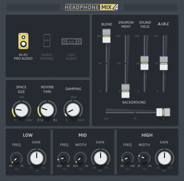 Headphone Mix features an environment simulation system where you can set room size, damp degree and reverb time of your work space. By doing so, Headphone Mix could obtain a closer result to your speakers.