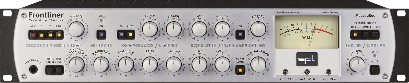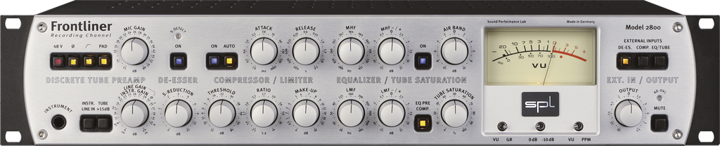 The Frontliner has all tools on board to record vocals and instruments in perfect quality: it merges a preamp, a de-esser, an EQ, a compressor and tube saturation.
