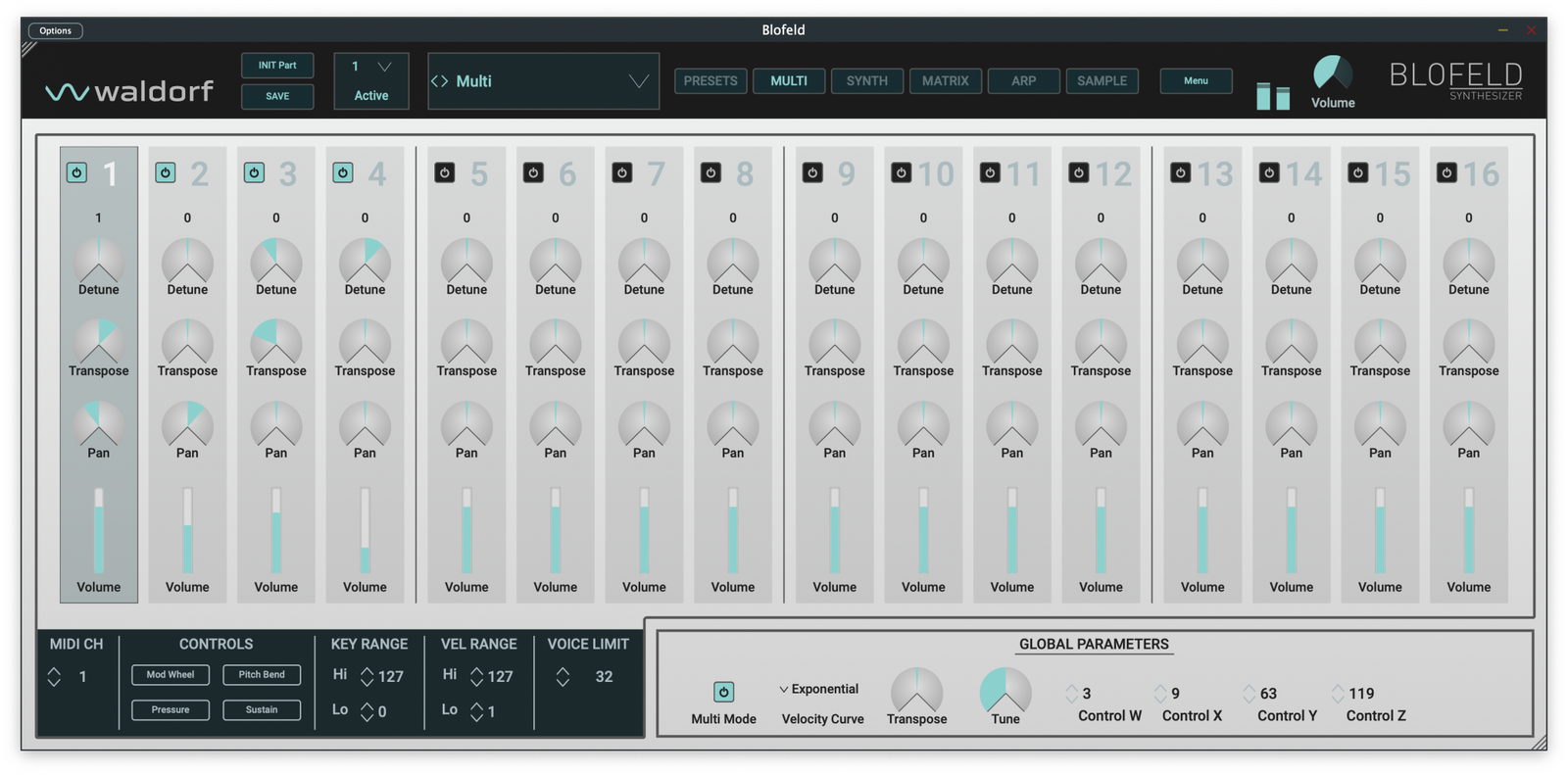 - 16 part multi timbral, which can be layered or split