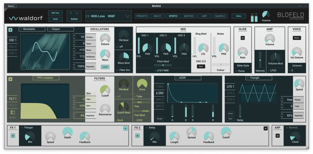 The sound generation of the Blofeld plug-in delivers the typical fat and rich Waldorf sound character that so many Waldorf users worldwide love. The secret of its sound is a powerful wavetable engine that enables these intense and expressive sounds.