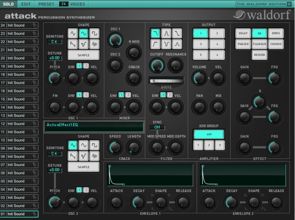 All PlugIns now have a radically revamped user interface. Besides this, 'Attack' now contains an exceptionally expanded effects section with Delay, Equalizer, Drive, Phaser, Flanger, Chorus and Reverb.