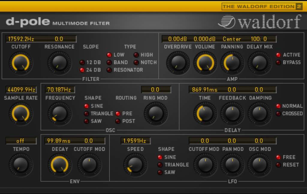 D-Pole completes the Waldorf Edition 2 lineup as a very versatile filter plug-in with five filter types (lowpass, bandpass, high pass, notch, and resonator), SAMPLE RATE reduction, RING MOD, OVERDRIVE (ranging up to +52 dB), and stereo delay — all in wondrous Waldorf quality!